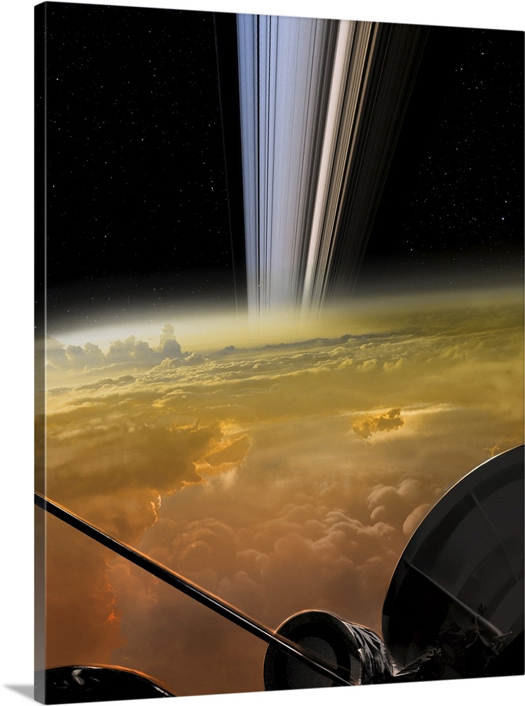 <p>Cassini's Grand Finale at Saturn. Illustration of a view of the upper atmosphere of Saturn from the Cassini spacecraft (partially seen at lower right) as it passes increasingly close to Saturn at the end of its mission. The Cassini spacecraft has been surveying the Saturnian system since 2004, with its mission scheduled to end with a final dive to destruction into Saturn's atmosphere on 15 September 2017. These 22 polar orbits and dives, and the final de-orbiting, are the concluding phase ('Grand Finale') of its mission. Image published in April 2017. Courtesy of NASA, JPL-Caltech.</p>
