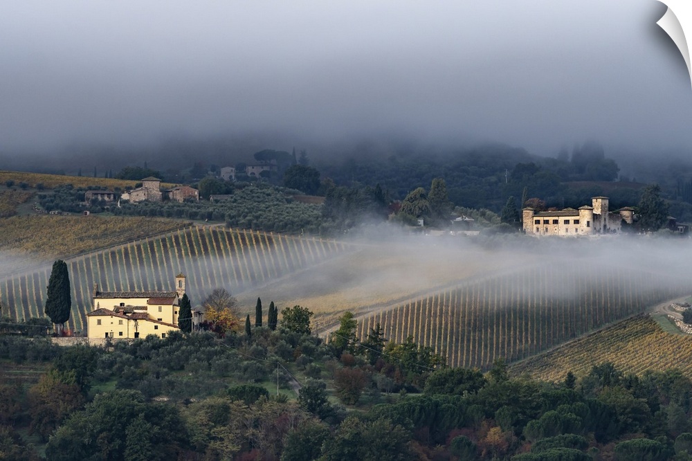 <p>Castello di Gabbiano across a misty valley, church in foreground, San Casciano, Tuscany, Italy, Europe</p>