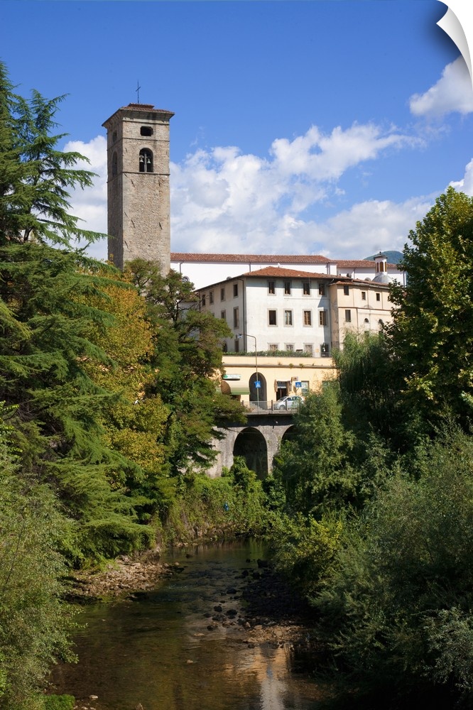 <p>Castelnuovo di Garfagnana, Tuscany, Italy - Old world buildings as seen behind a small waterway and trees. Vertical shot.</p>