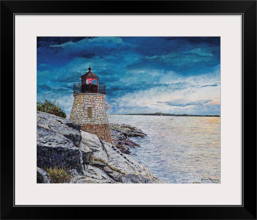 <p>A contemporary landscape painting of a stone lighthouse by a rocky seashore.</p>