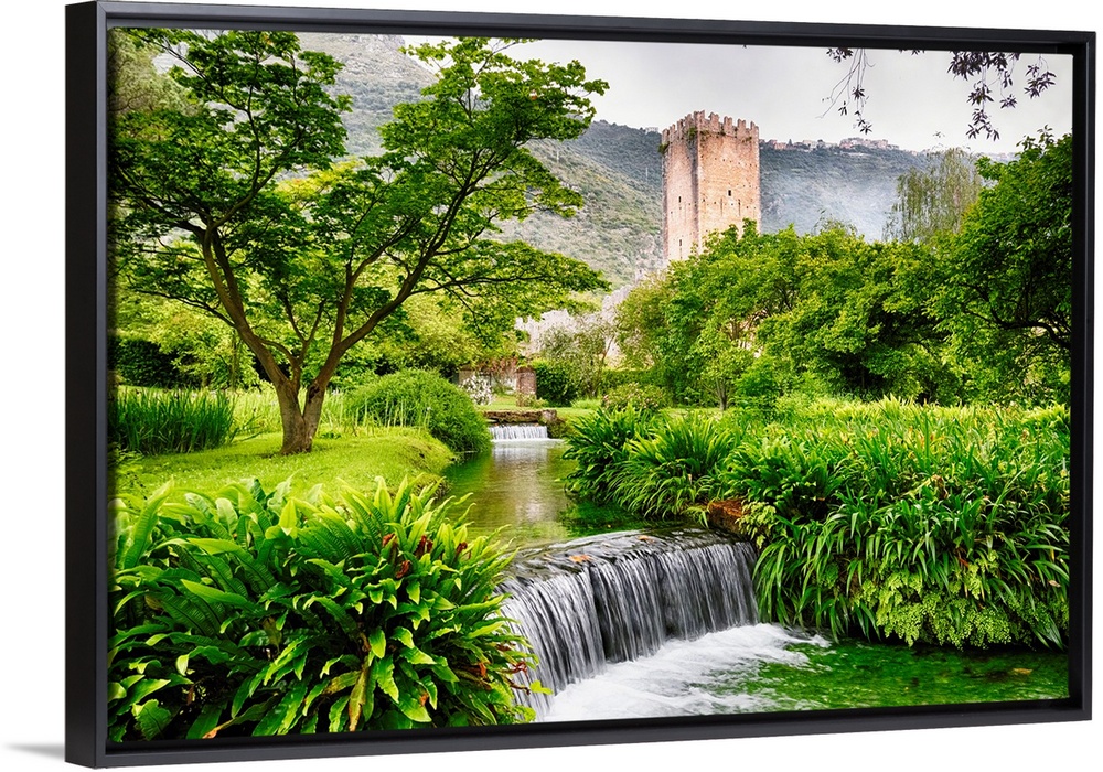 <p>Cascading creek in a garden with a Medieval Tower, Latina Italy.</p>