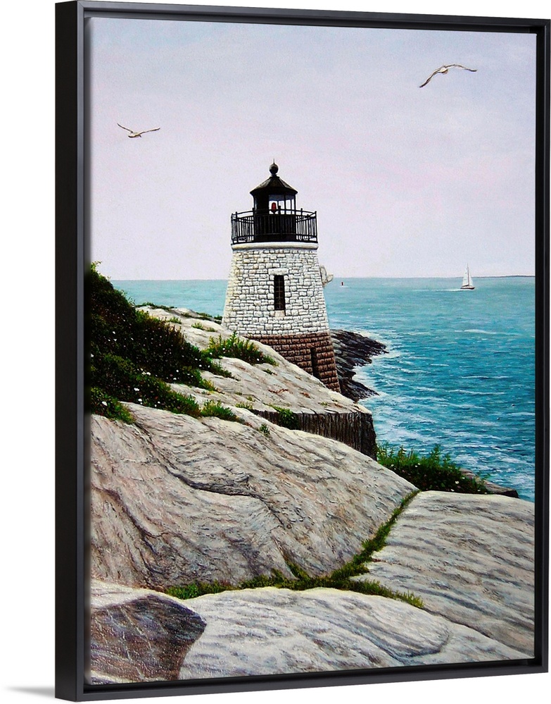 <p>Contemporary painting of the Castle Hill Lighthouse overlooking the ocean and seagulls in sky.</p>
