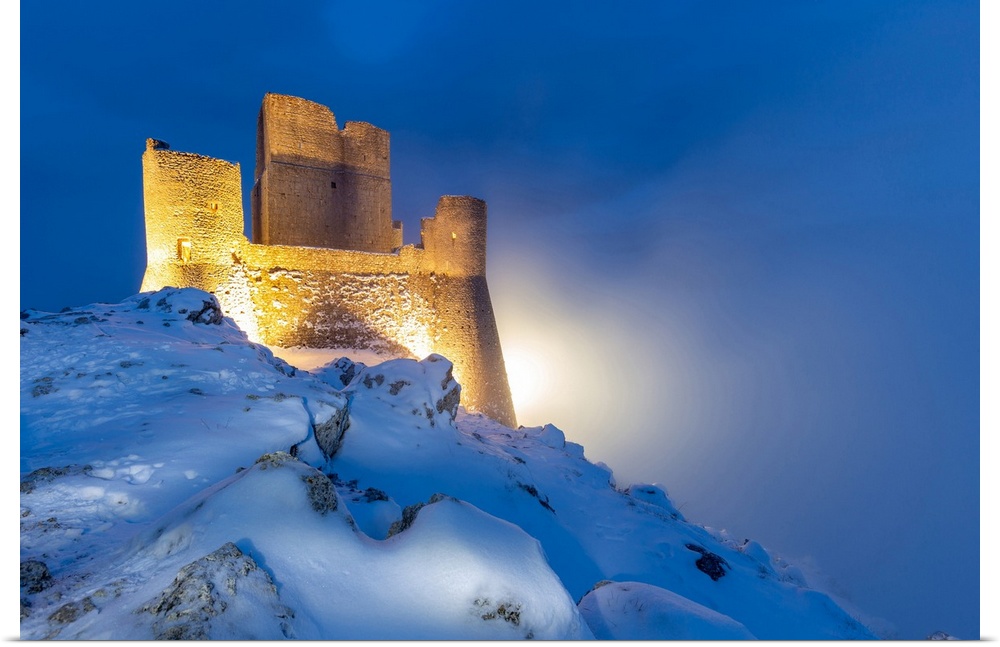 <p>Castle of Rocca Calascio in winter during the dusk-Europe, Italy, Abruzzo, Province of L'Aquila, Gran Sasso e Monti della Laga National Park</p>