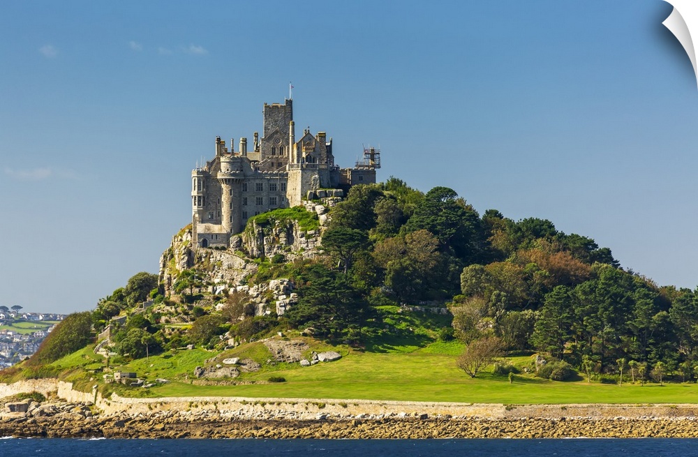 <p>Castle of St. Michael perched on top of a rocky hill along a shoreline, surrounded by trees with blue sky; Cornwall County, England.</p>