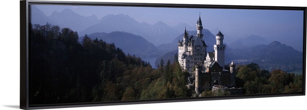 <p>A grand historic castle sits perched at the top of a hill in Central Europe, amidst a forest of pine trees and tall mountains.</p>
