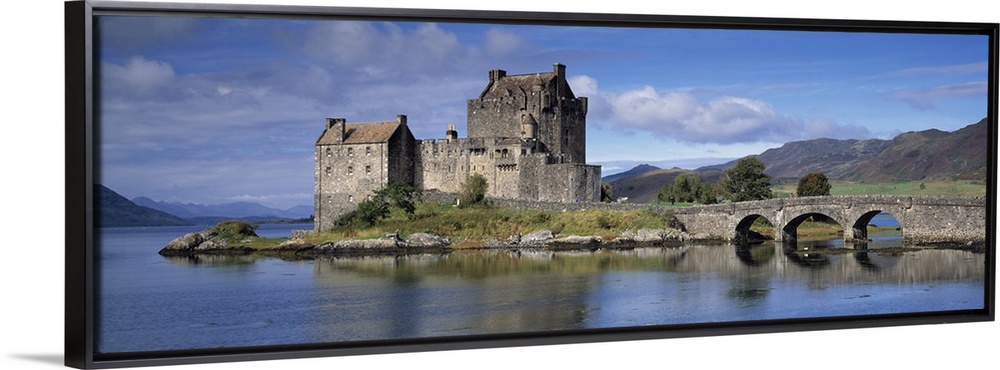 <p>Panoramic photograph of a bridge over Loch Duich, leading to a large, old castle on Eilean Donan Island, mountains in the distant background, in the Dornie Highlands region of Scotland.</p>