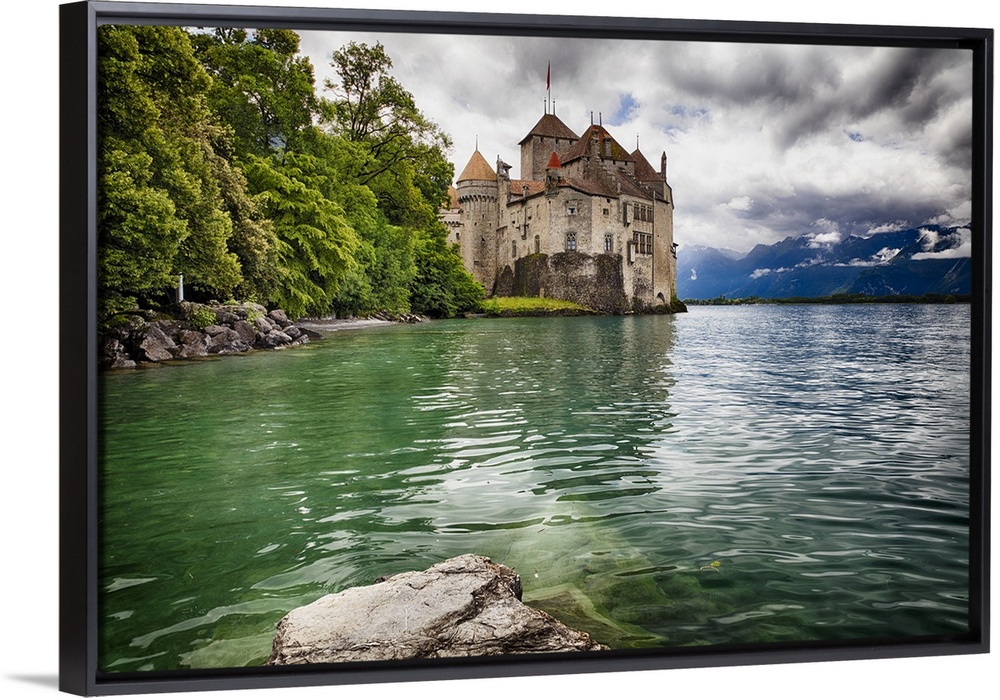 <p>The Chateau de Chillon on the edge of Lake Geneva, with the Alps in the distance on a cloudy day, Switzerland.</p>