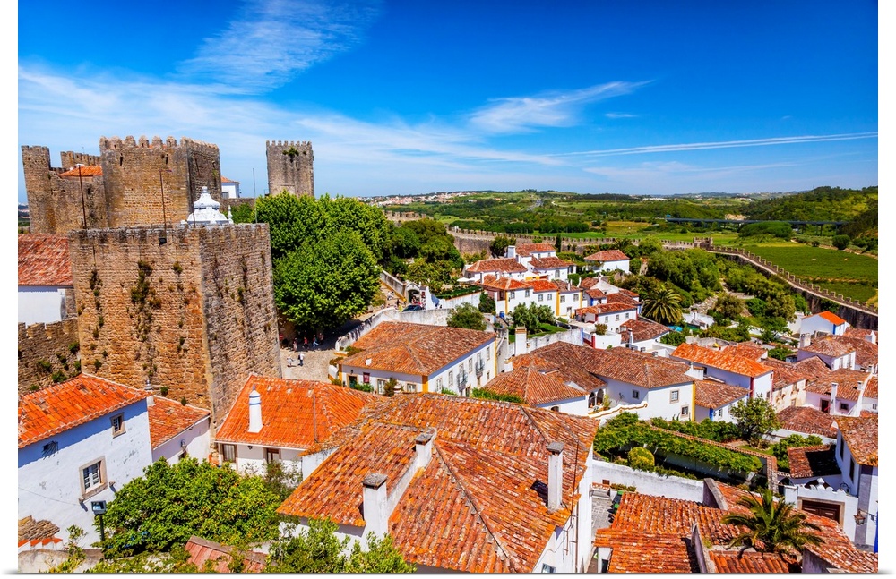 <p>Castle Wals Turrets Towers Medieval Town Obidos Portugal. Castle and walls built in 11th century after town taken from the Moors.</p>