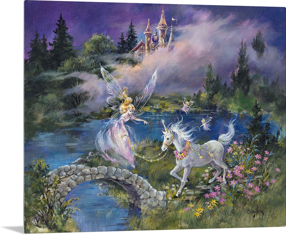 <p>Whimsical contemporary fantasy artwork of fairies and unicorns in an enchanted garden.</p>
