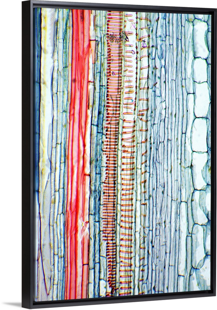 <p>Castor oil stem. Light micrograph of a longitudinal section through the stem of a castor oil (Ricinus communis) plant. At right are large and small parenchyma cells (blue). Immediately to their left are two rows of proto-xylem vessels and one row of spiral meta-xylem (both red), which transport water around the plant. To the left of this is a bundle of phloem fibres (red) sandwiched between two groups of phloem cells (blue). Magnification: x45 when printed at 10 centimetres tall.</p>
