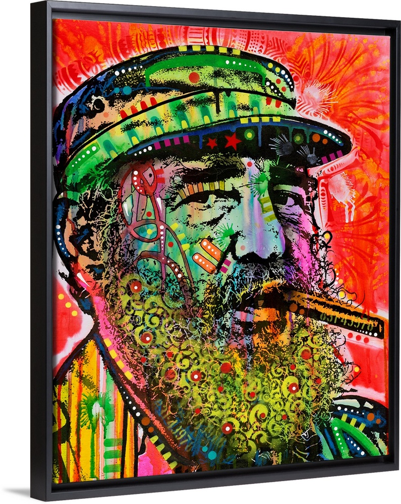 <p>Pop art style painting of Fidel Castro smoking a cigar with different colors and abstract designs all over.</p>