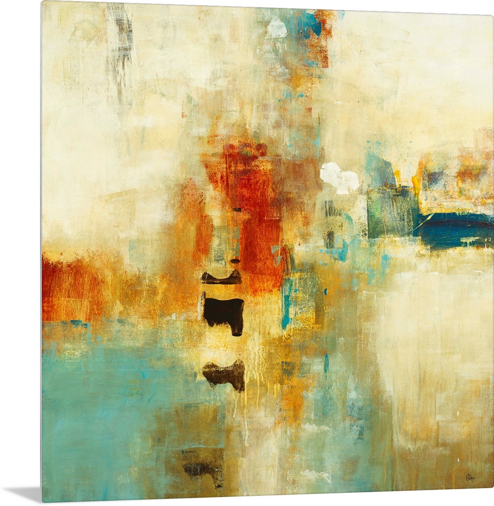 <p>Square abstract painting of warm tone colors of blue, orange and yellow.</p>