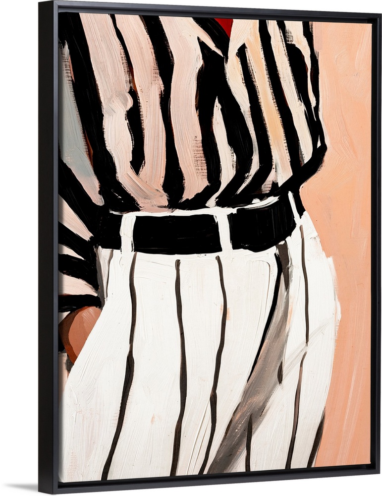 <p>A close-up of a painting in the style of Matisse and Hiroshi Nagai, of a woman wearing white striped trousers. Rough painted, brush strokes, edgy pose, confident, she is also wearing an oversized, striped black and white shirt and a black belt. Her face is not visible. Only red lipstick, the background has a pastel peach color scheme.</p>