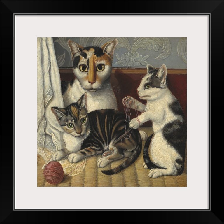 <p>Cat and Kittens, by Anonymous, c. 1872-83, American painting, oil on millboard. Naive painting of a cat and two kittens playing with a ball of yarn</p>