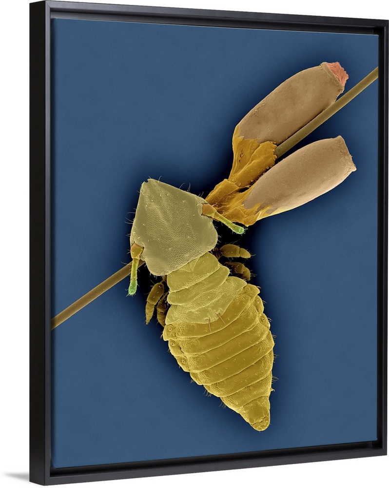 <p>Coloured scanning electron micrograph (SEM) of Cat biting louse and egg cases (Felicola subrostratus). The cat biting louse is the only louse ectoparasite occurring on cats. Ectoparasites are parasites that live on the external body of the host. Other non-louse ectoparasites on cats include fleas (insects) and mites (arachnids). Biting lice have mouthparts that are designed for chewing, not sucking, and they feed on hair or skin scales. An infestation of lice is called pediculosis. Adult females lay their egg cases with in the animals hair by cementing the egg case to the hair shaft. Magnification: x16 when shortest axis printed at 25 millimetres.</p>