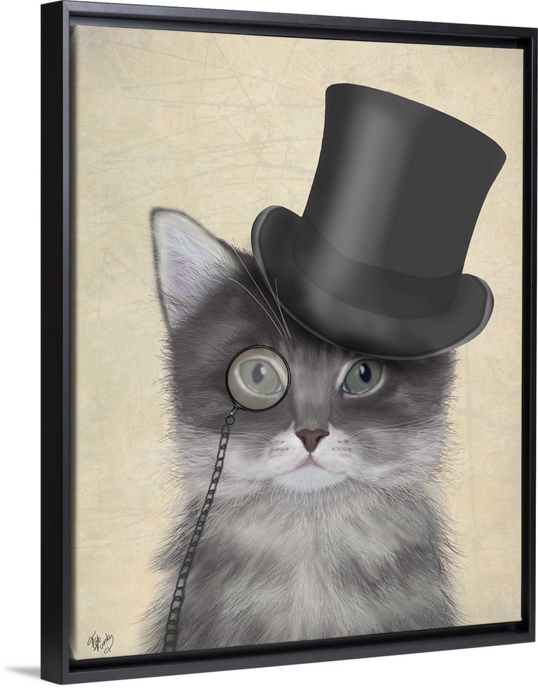 <p>A cute gray cat wearing a monocle and top hat.</p>