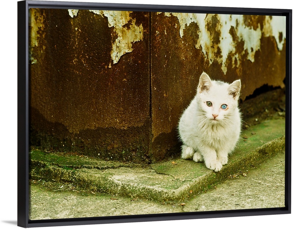 <p>A white cat sitting on a mossy curb in Tokyo, Japan.</p>