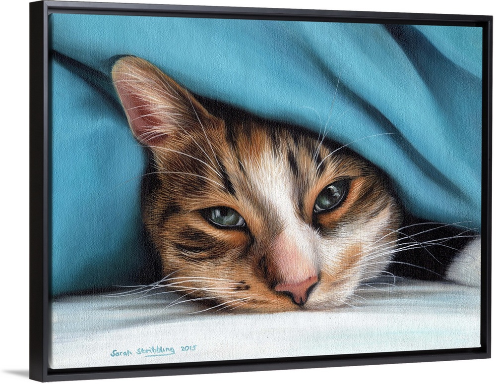 <p>Oil painting on canvas of a domestic cat under a blanket.</p>