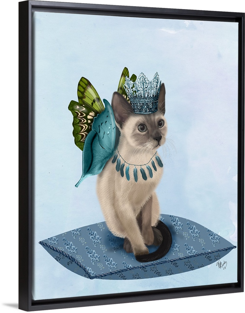 <p>A cat with butterfly wings sitting on a pillow.</p>