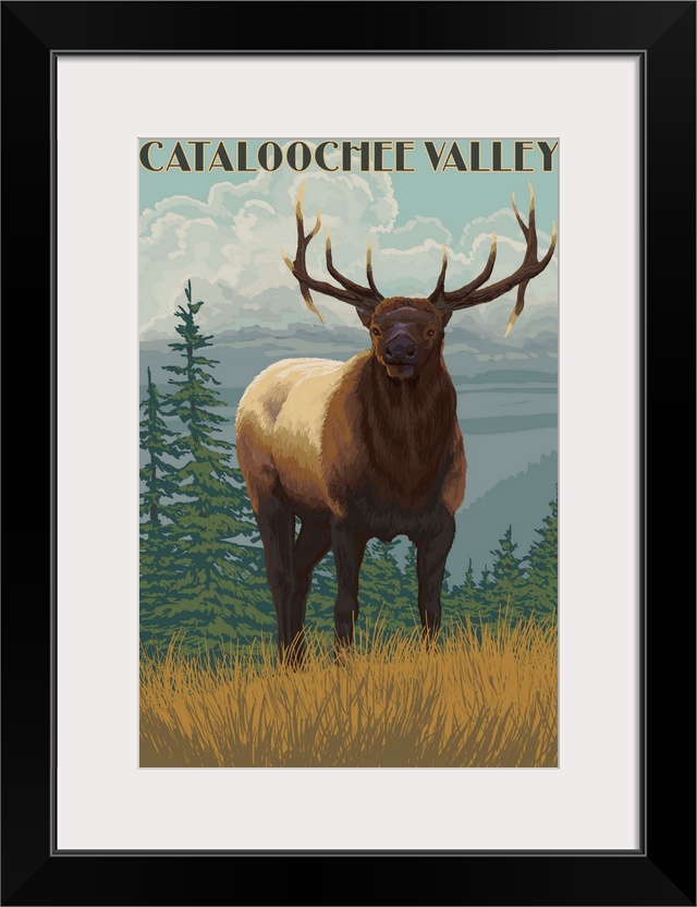 <p>Retro stylized art poster of an elk in the wilderness, gazing deeply at the viewer.</p>