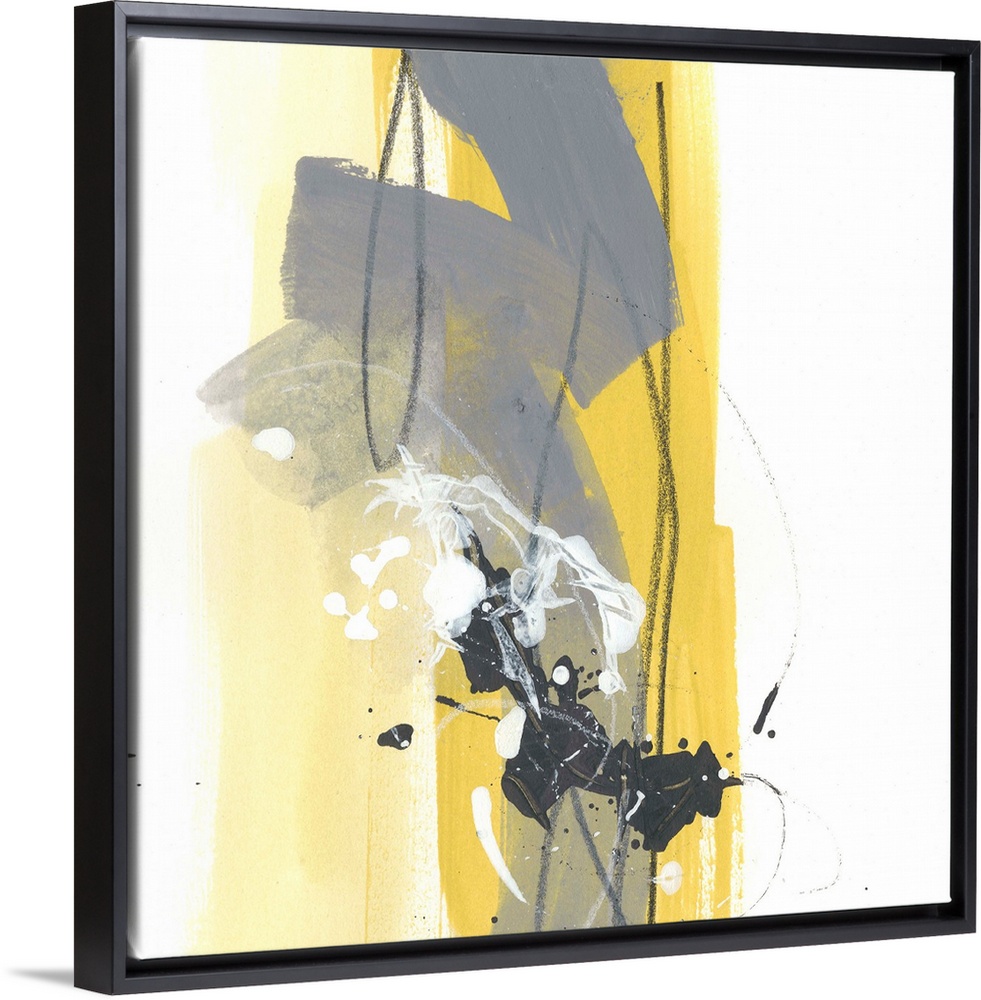 <p>Contemporary abstract art in yellow and grey on white with thin black brushstrokes.</p>