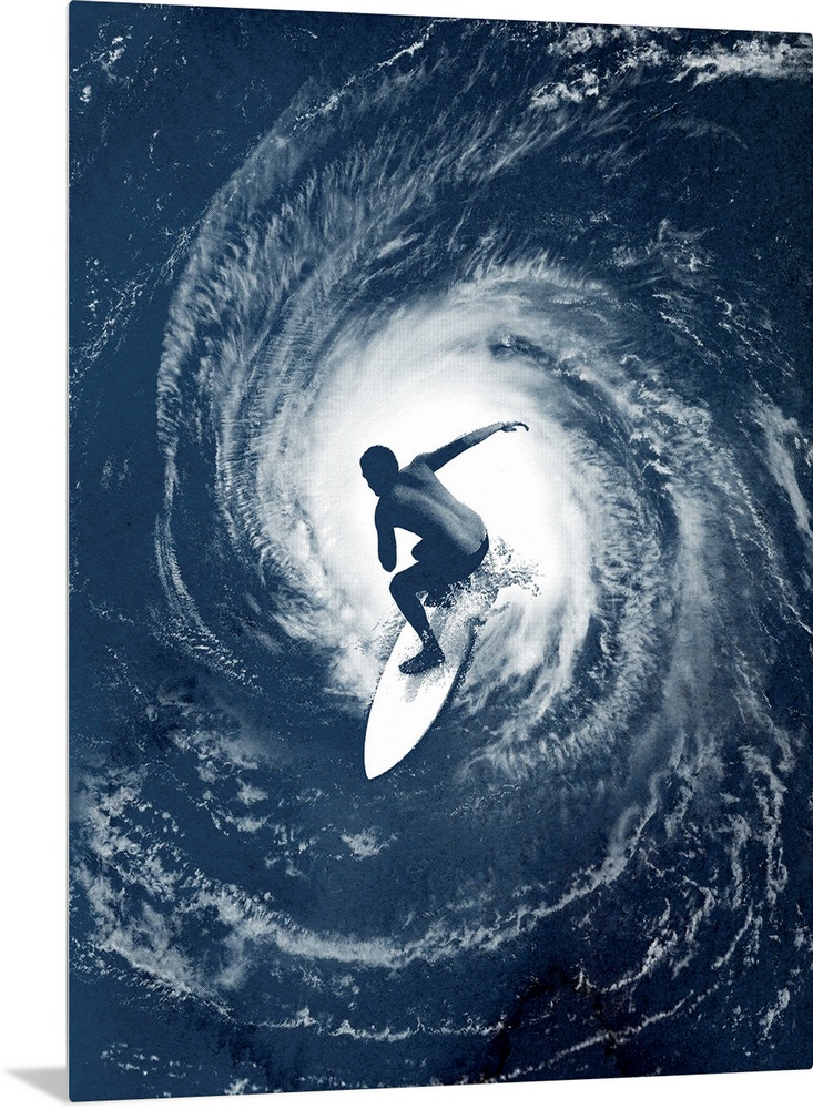 <p>Big photo on canvas of a surfer on top of an image of a hurricane in the ocean.</p>