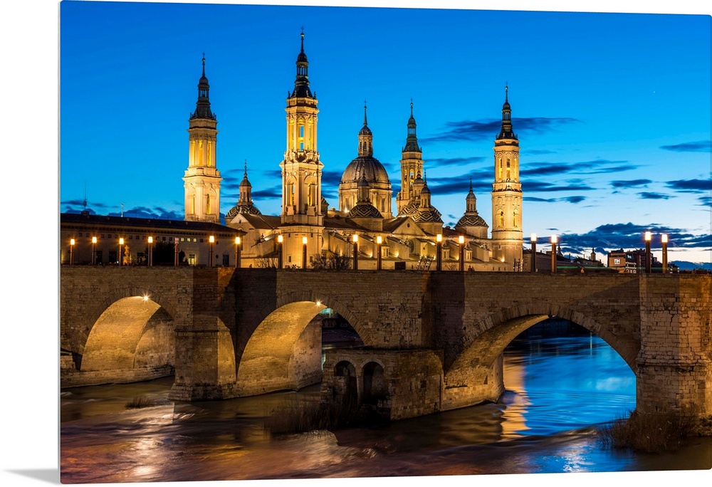 <p>Cathedral Of Our Lady Of The Pillar And Stone Bridge At Dusk. Zaragoza, Aragon, Spain</p>