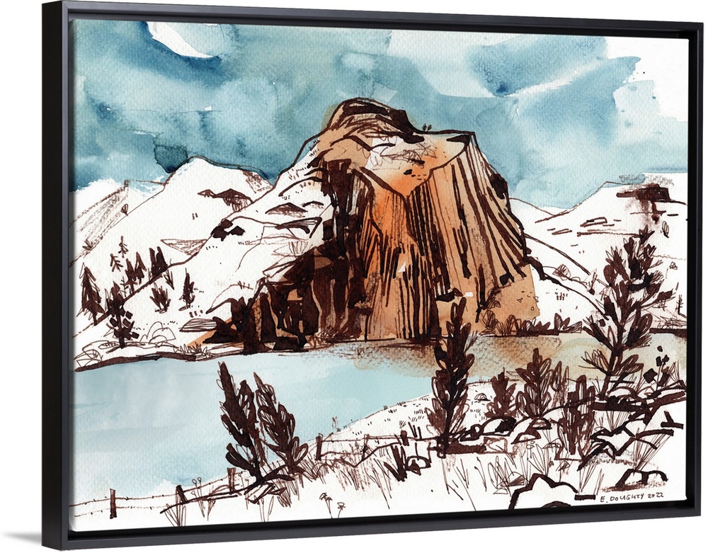 <p>Cathedral Rock in Oregon is carved by the flowing John Day River at its base. The scene was captured in ink and watercolor.</p>