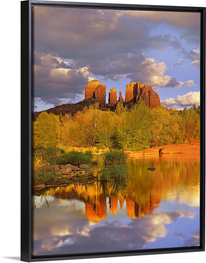 <p>Towering red rock mountains reflect in Oak Creek as a few deciduous trees line the creek bed with the setting sun beating down on them.</p>