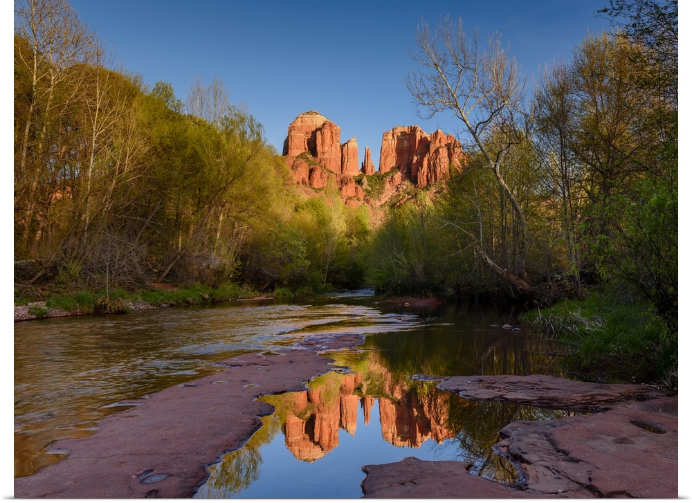 <p>Landscape photograph of Cathedral Rock reflecting into a low, rocky river, Sedona AZ.</p>