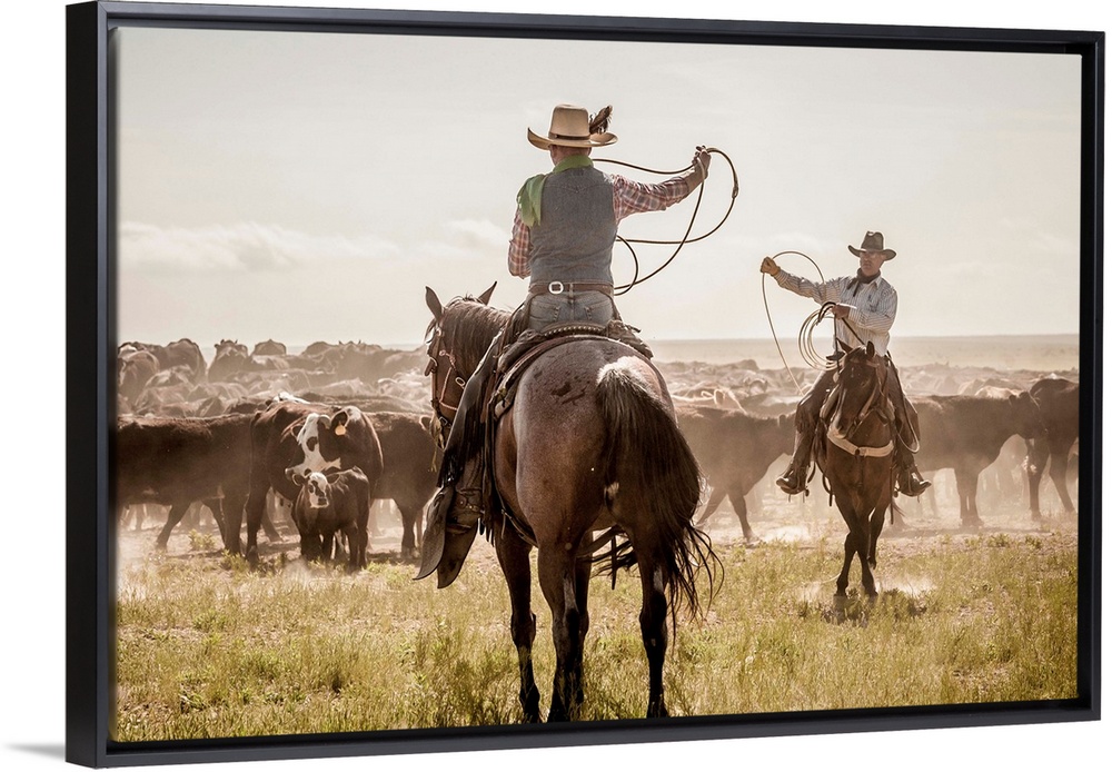 <p>Photograph of two cowboys with their lassos in the air while herding cattle.</p>