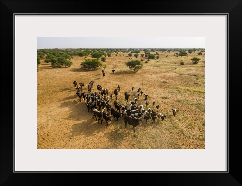 <p>Aerial of cattle moving to a waterhole, Gerewol festival, courtship ritual competition among the Wodaabe Fula people, Niger, West Africa, Africa</p>