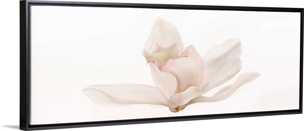 <p>Photograph of a white Cattleya orchids on a white background.</p>