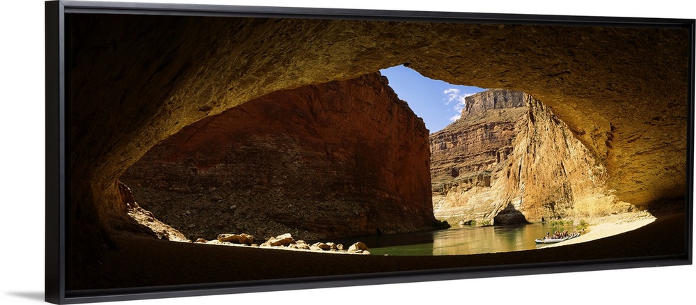 <p>Wide angle photograph, looking out of a large cave opening near the Colorado River in Arizona. Large sandstone formations can be seen outside of the cave, golden in the sunlight.</p>