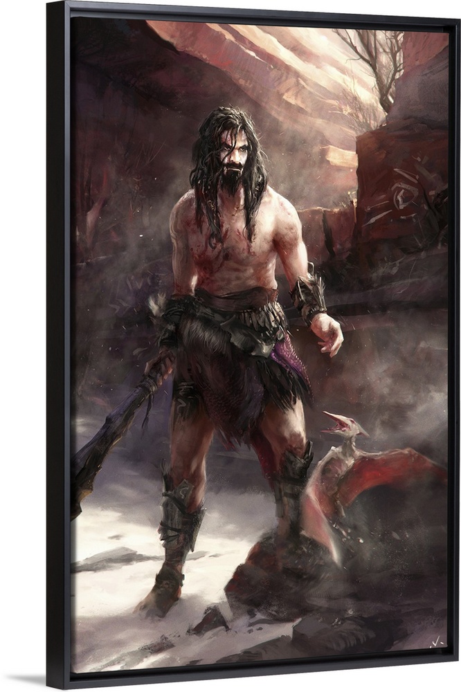 <p>Painting of caveman and dinosaurs in desert canyon environment.</p>