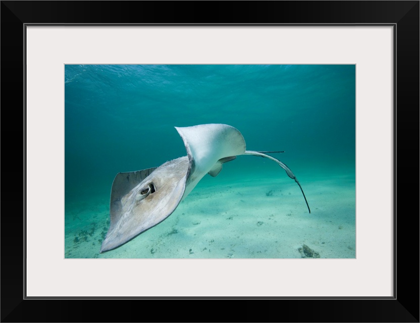 <p>Cayman Islands, Grand Cayman Island, Underwater view of Southern Stingray (Dasyatis americana) in shallow water near Stingray City in Caribbean Sea</p>