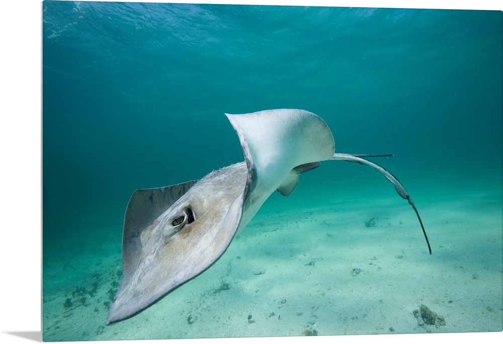 <p>Cayman Islands, Grand Cayman Island, Underwater view of Southern Stingray (Dasyatis americana) in shallow water near Stingray City in Caribbean Sea</p>