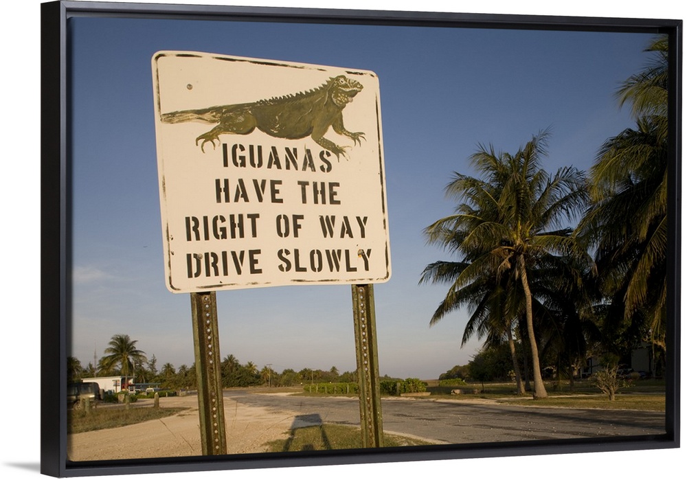 <p>Cayman Islands, Little Cayman Island, Iguana Crossing Sign along country road</p>