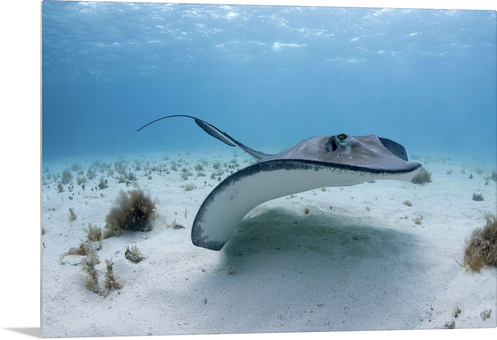 <p>Cayman Islands, Grand Cayman Island, Underwater view of Southern Stingray (Dasyatis americana) in shallow water near Stingray City in Caribbean Sea</p>