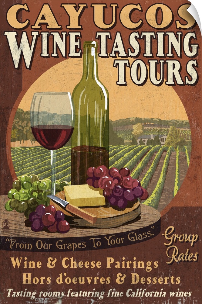 <p>Retro stylized art poster of vintage sign displaying a wine glass with bottle and cheese, and a vineyard in the background.</p>