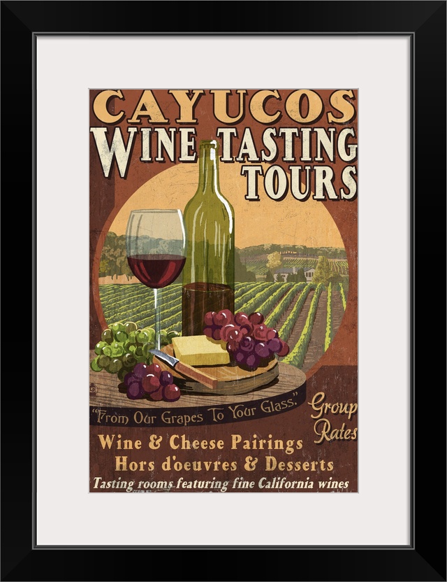 <p>Retro stylized art poster of vintage sign displaying a wine glass with bottle and cheese, and a vineyard in the background.</p>