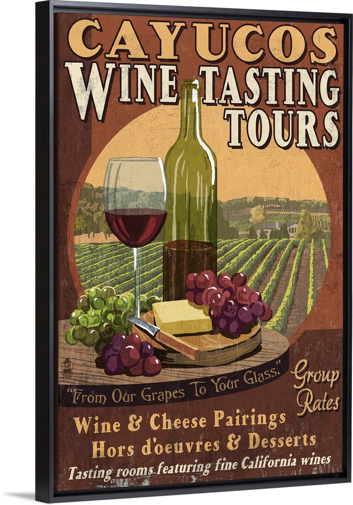 <p>Retro stylized art poster of vintage sign displaying a wine glass with bottle and cheese, and a vineyard in the background.</p>