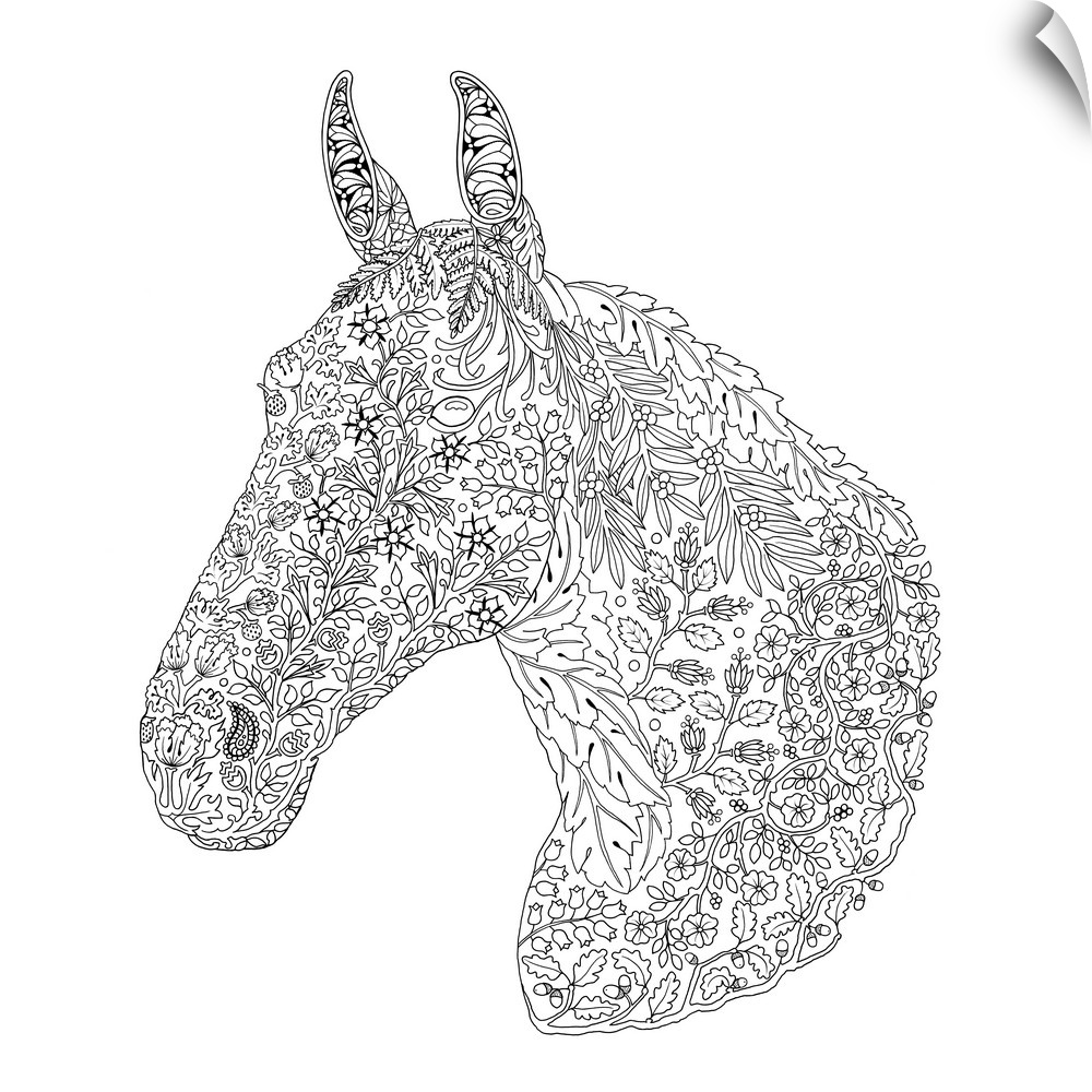 <p>Black and white line art of a horse made with an intricate floral design.</p>
