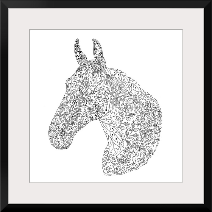 <p>Black and white line art of a horse made with an intricate floral design.</p>