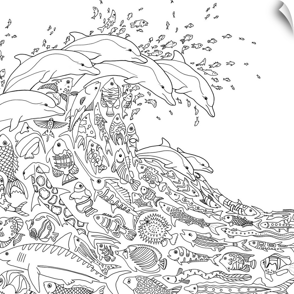 <p>Black and white line art of a giant wave made out of different types of fish and dolphins.</p>