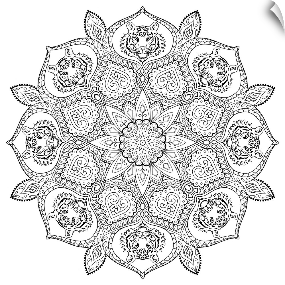 <p>Black and white line art of an intricately designed mandala with tigers on each point.</p>