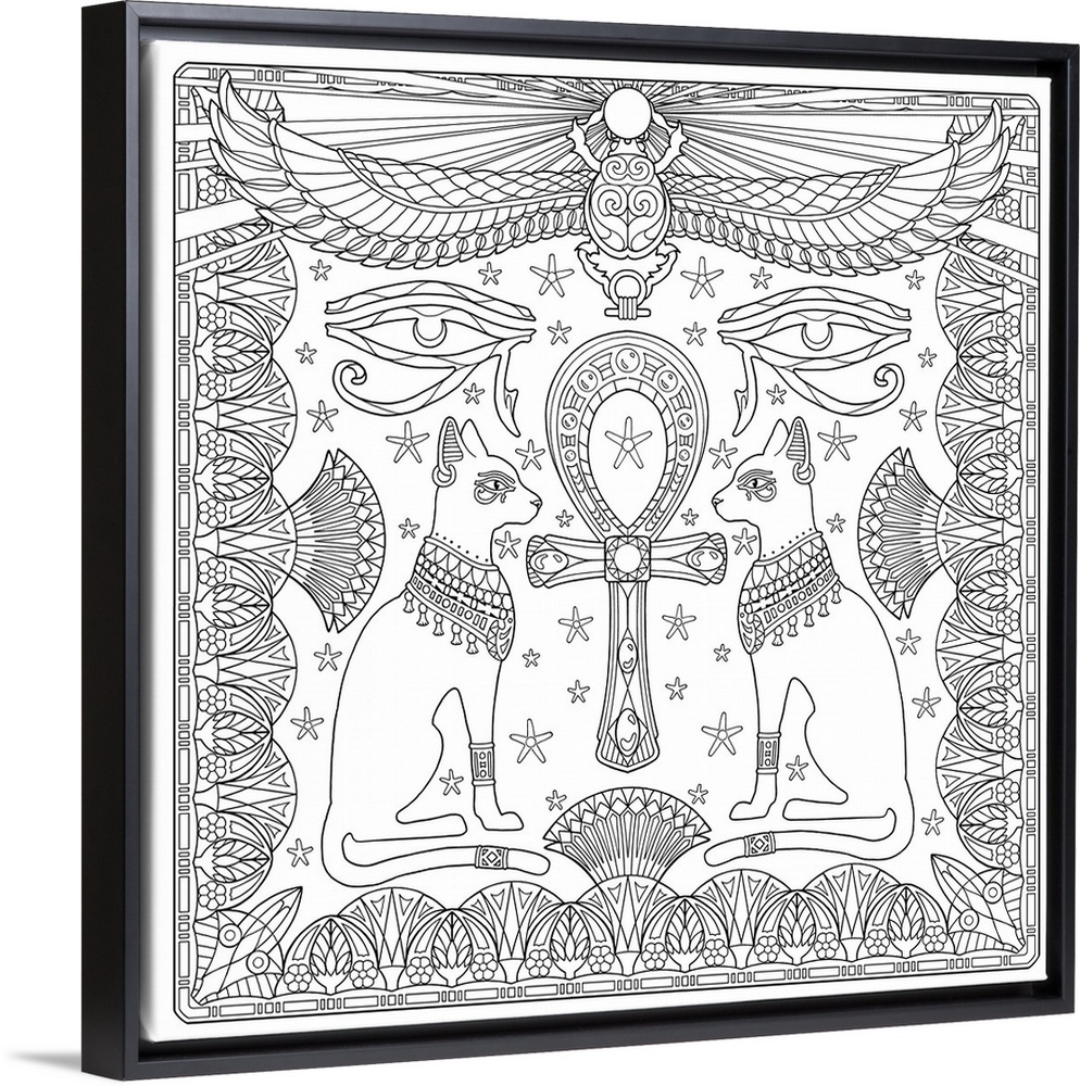 <p>Contemporary line art design with Egyptian cats and intricate designs.</p>