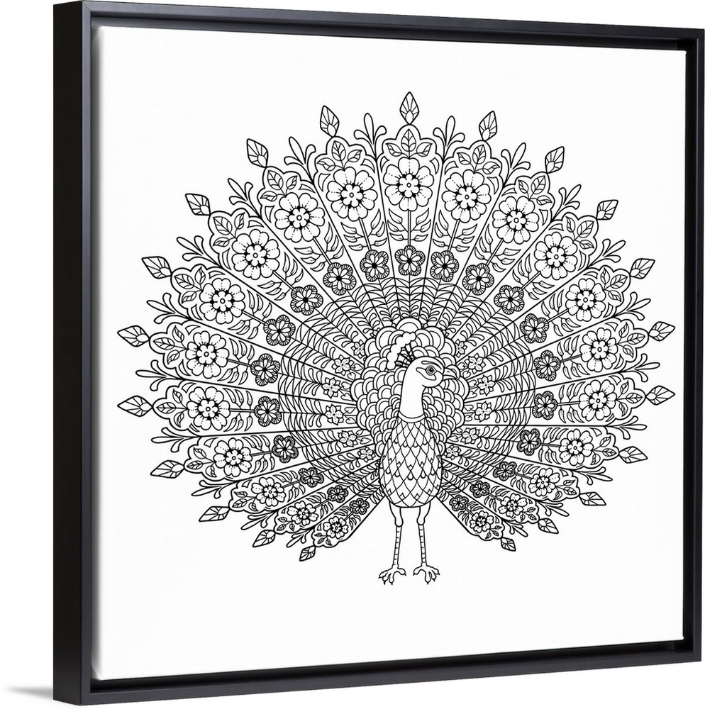 <p>Black and white line art of a peacock with floral patterned feathers.</p>
