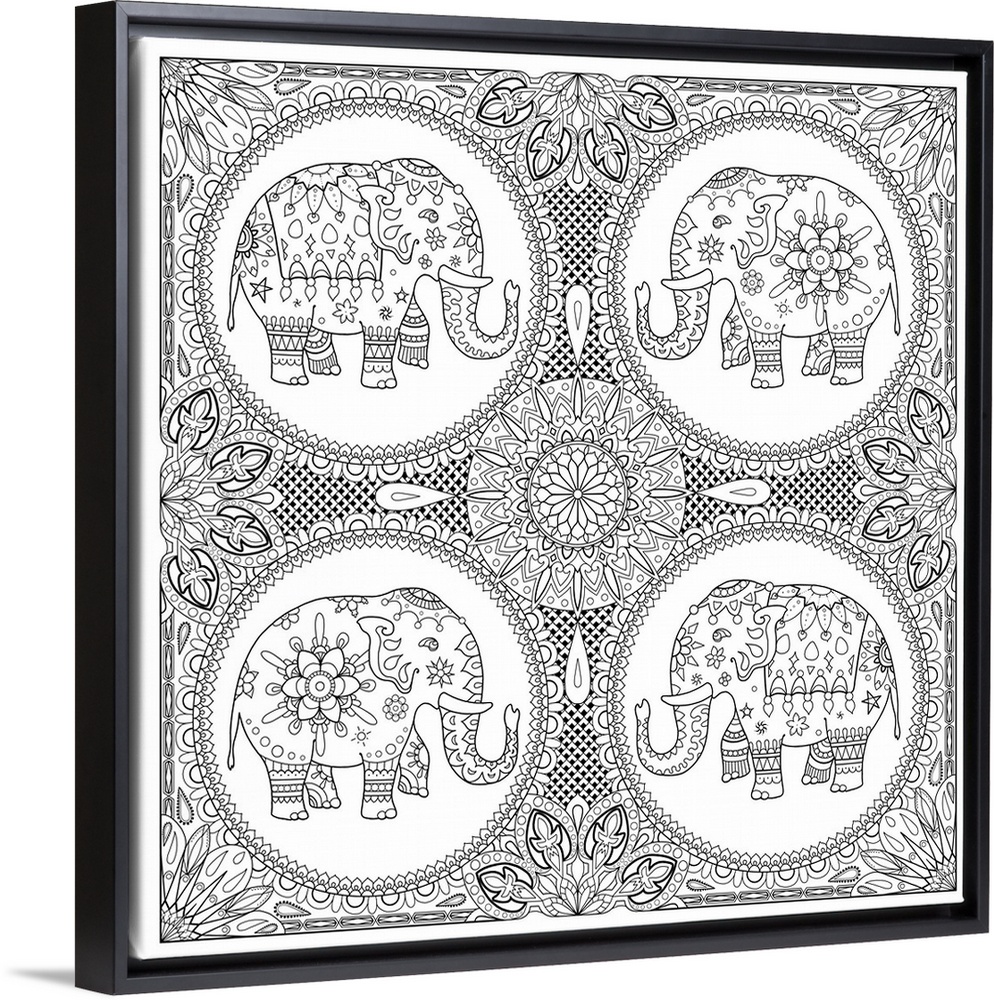 <p>Black and white line art with intricate designs and four circles with uniquely patterned elephants in each.</p>