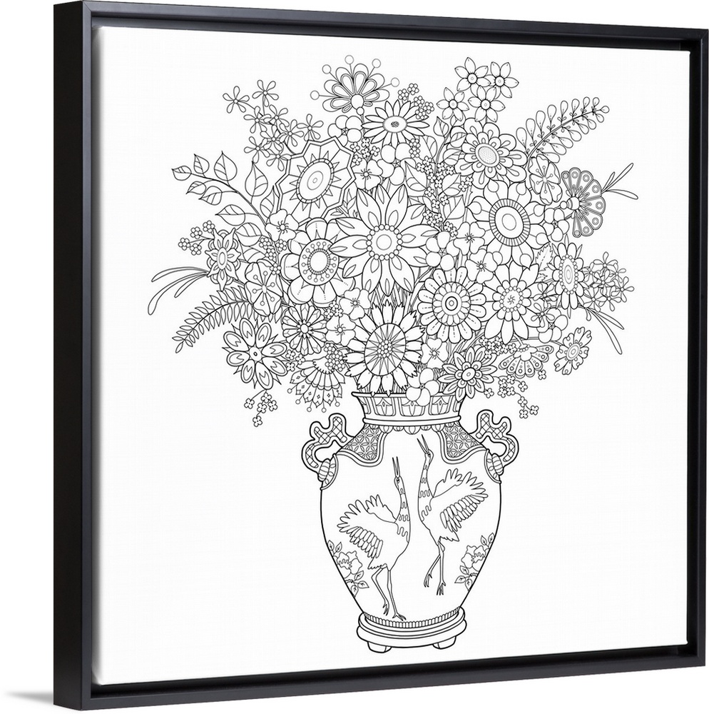 <p>Black and white line art of arranged flowers in a vase with two storks on it.</p>